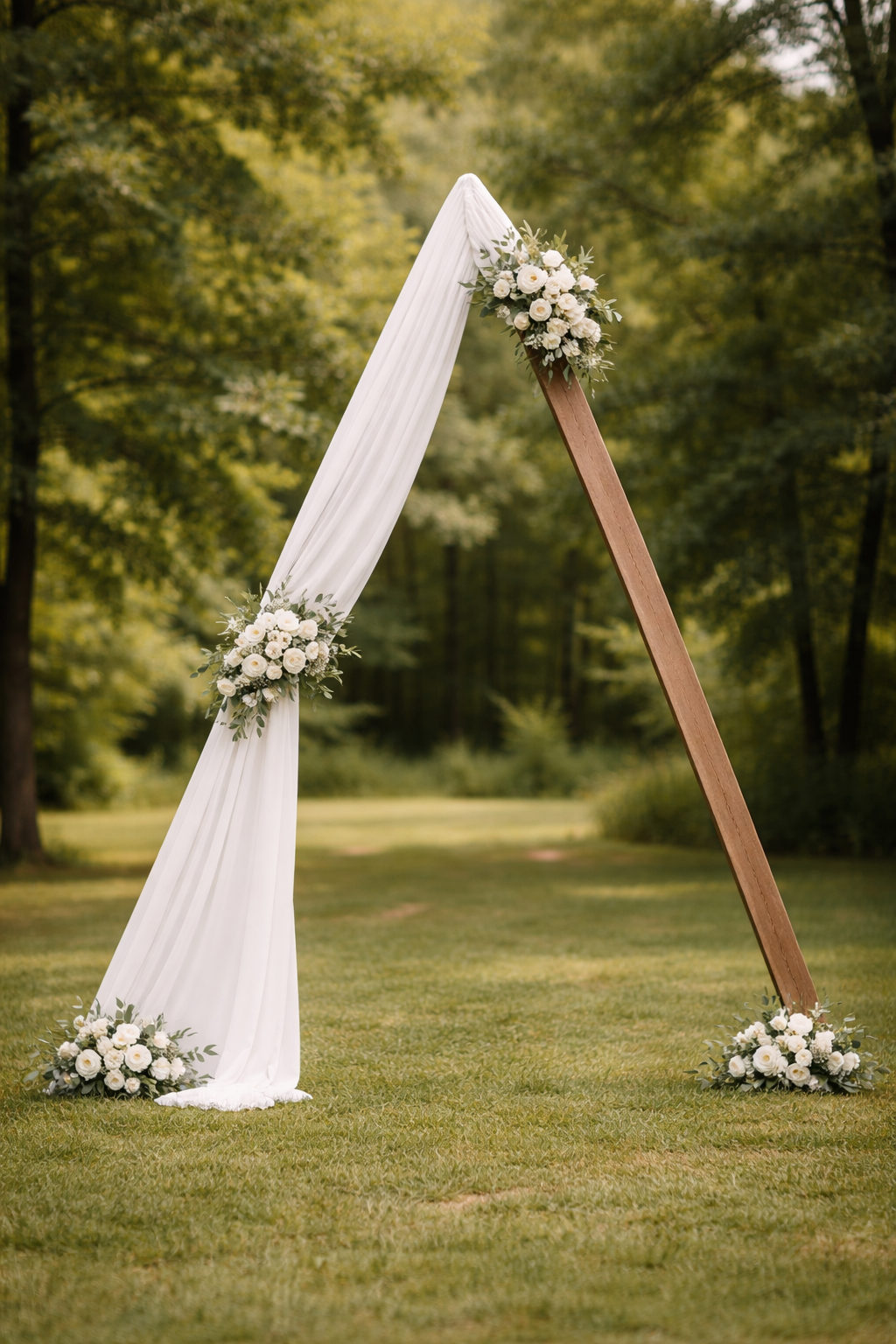Wooden triangular ceremony arch with white draping and two floral swags